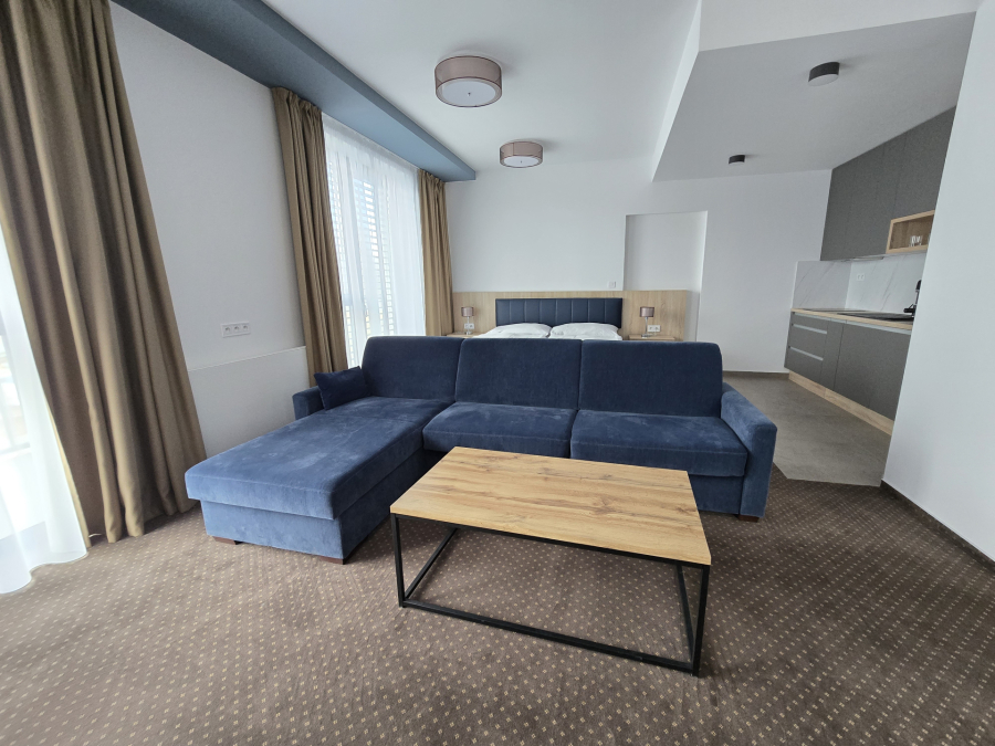 Apartmány na 1. a 4. poschodí s výťahom ponúkajú komfortné ubytovanie. Apartmány majú manželskú posteľ a obývačku s rozkladacím gaučom, ktorý je vhodný pre maximálne 2 osoby (matrac s rozlohou: 160 cm x 190cm). Súčasťou je aj jedálenský stôl so stoličkami. Apartmán je tiež vybavený trezorom, klimatizáciou, šatníkovými skriňami a skrinkami, pracovným stolom so stoličkou a dvomi TV. Niektoré apartmány majú balkón. Hostia majú k dispozícii aj župany a uteráky. Kúpeľňa je vybavená sprchou.