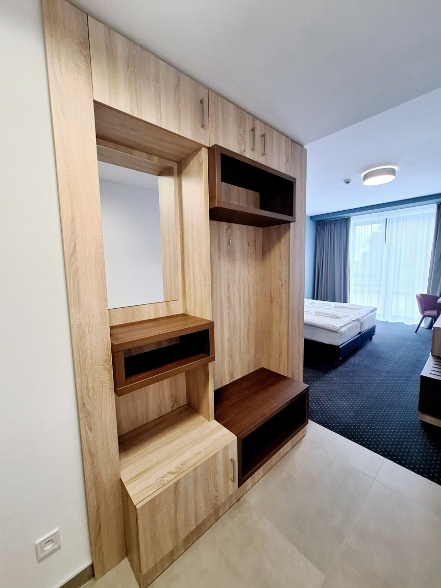 Izba Štandard na 3. poschodí s výťahom ponúka komfortné a moderné ubytovanie. Izba má manželskú posteľ, trezor, chladničku a klimatizáciu. K dispozícii je aj šatníková skriňa a skrinky, stôl so stoličkou, TV, župany a uteráky.