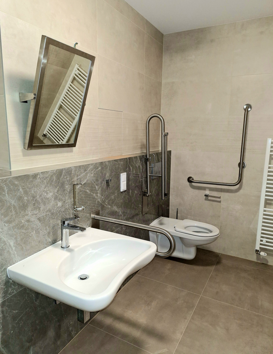 - Bezbariérová kúpeľňa so sprchou a toaletou pre imobilných