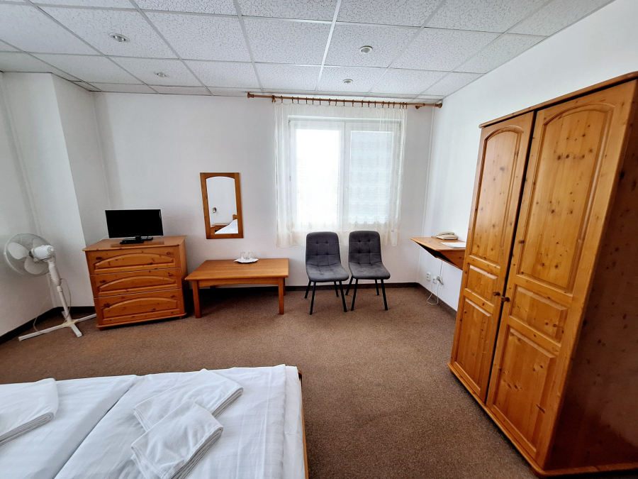 Táto izba kombinuje pohodlie a praktické vybavenie a vytvára príjemné prostredie pre oddych a relaxáciu.
