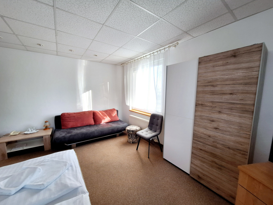 Táto izba kombinuje pohodlie a praktické vybavenie a vytvára príjemné prostredie pre oddych a relaxáciu.