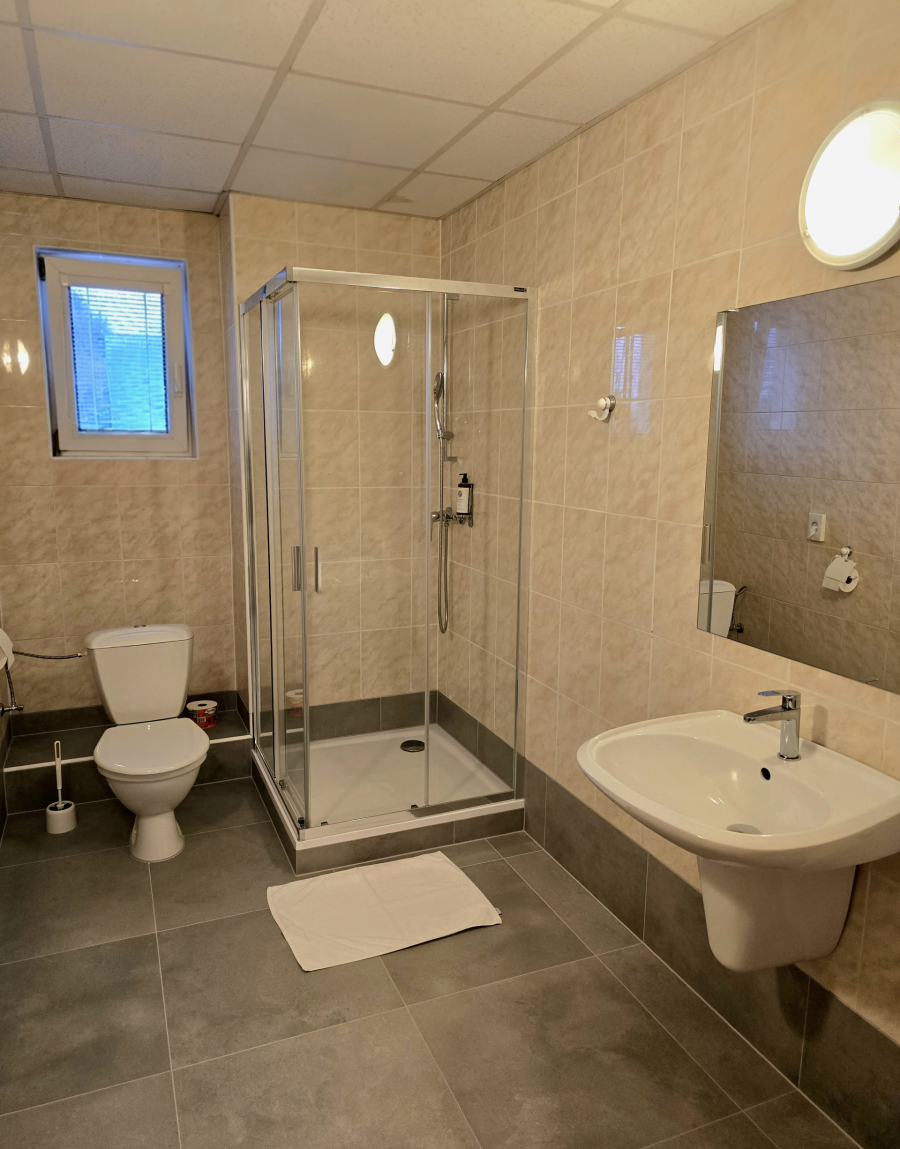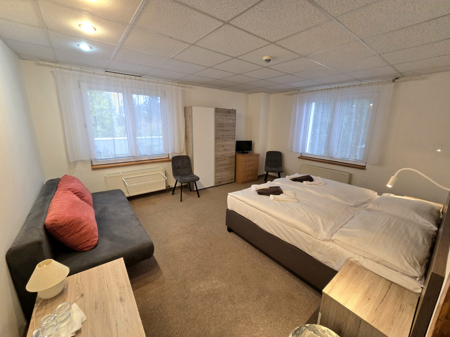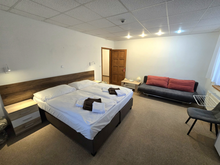 Dvojlôžková izba Klasik sa nachádza na 1. poschodí (bez výťahu). Disponuje manželskou posteľou a pohodlným rozkladacím gaučom, ktorý slúži aj ako prístelka pre max. 2 deti do 15 rokov (do 14,99 r.). Izba je vybavená šatníkovou skriňou na uskladnenie vecí, stoličkami alebo taburetkami a TV pre večerný oddych. Nájdete tu aj sušiak na prádlo a dostatok županov a uterákov pre príjemný pobyt. Kúpeľňa je vybavená sprchovým kútom.